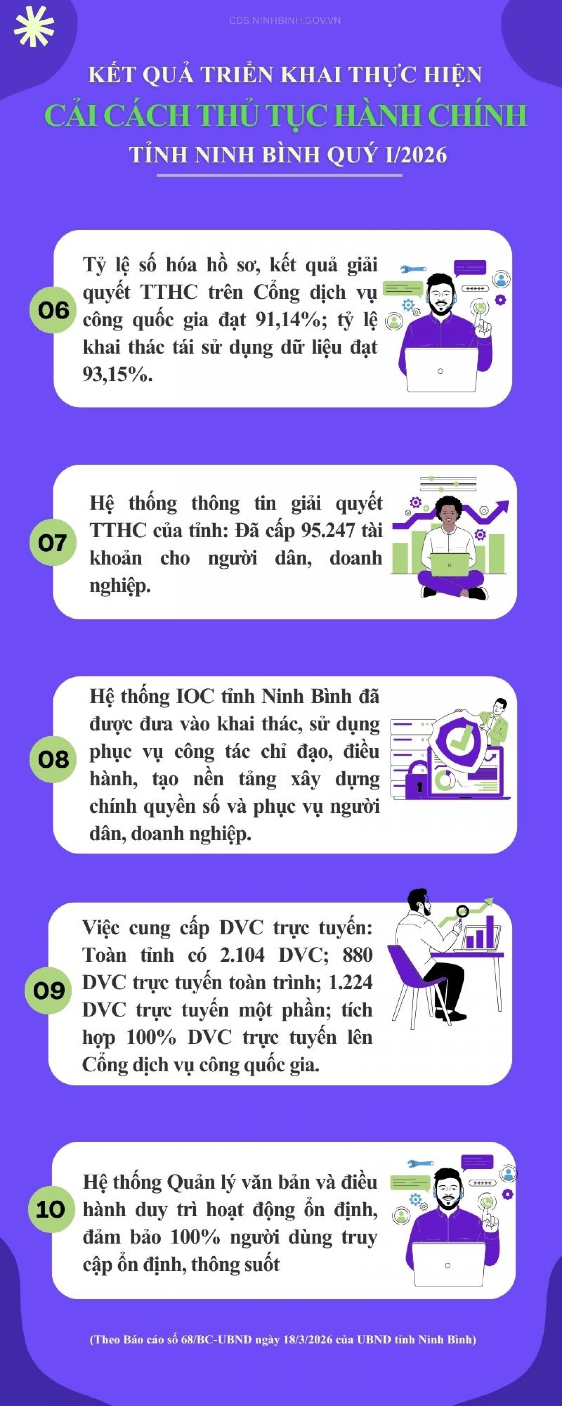 Căn cứ Báo cáo tình hình, kết quả triển khai thực hiện Nghị quyết số 131/NQ-CP ngày 06/10/2022 của Chính phủ về đẩy mạnh cải cách thủ tục hành chính và hiện đại hóa phương thức chỉ đạo, điều hành phục vụ người dân, doanh nghiệp Quý I/2026 (Báo cáo số 68/BC-UBND ngày 18/3/2026 của UBND tỉnh Ninh Bình), sau đây là nội dung tóm tắt một số kết quả nổi bật: